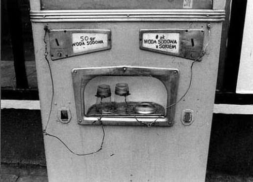Przede wszystkim brakuje szklanych butli mocowanych do widocznego łukowatego wysięgnika. Były zwykle dwie na różne rodzaje soku. Zanim przyszła inflacja w latach 70 sodowa czysta kosztowała chyba 20 gr. z sokiem 50. Niestety skąpstwo ajentów powodowało, że soku nalewali tylko trochę na dno, przez co smak był słabo wyczuwalny. Szklanki były płukane symbolicznie krótkim strumieniem wody ze specjalnej dyszy, a mimo to zwalczono w tamtym czasie choroby zakaźne, zwłaszcza gruźlicę. Co do szklanek na lince to występowały one w innym typie, samoobsługowym, produkcji radzieckiej.